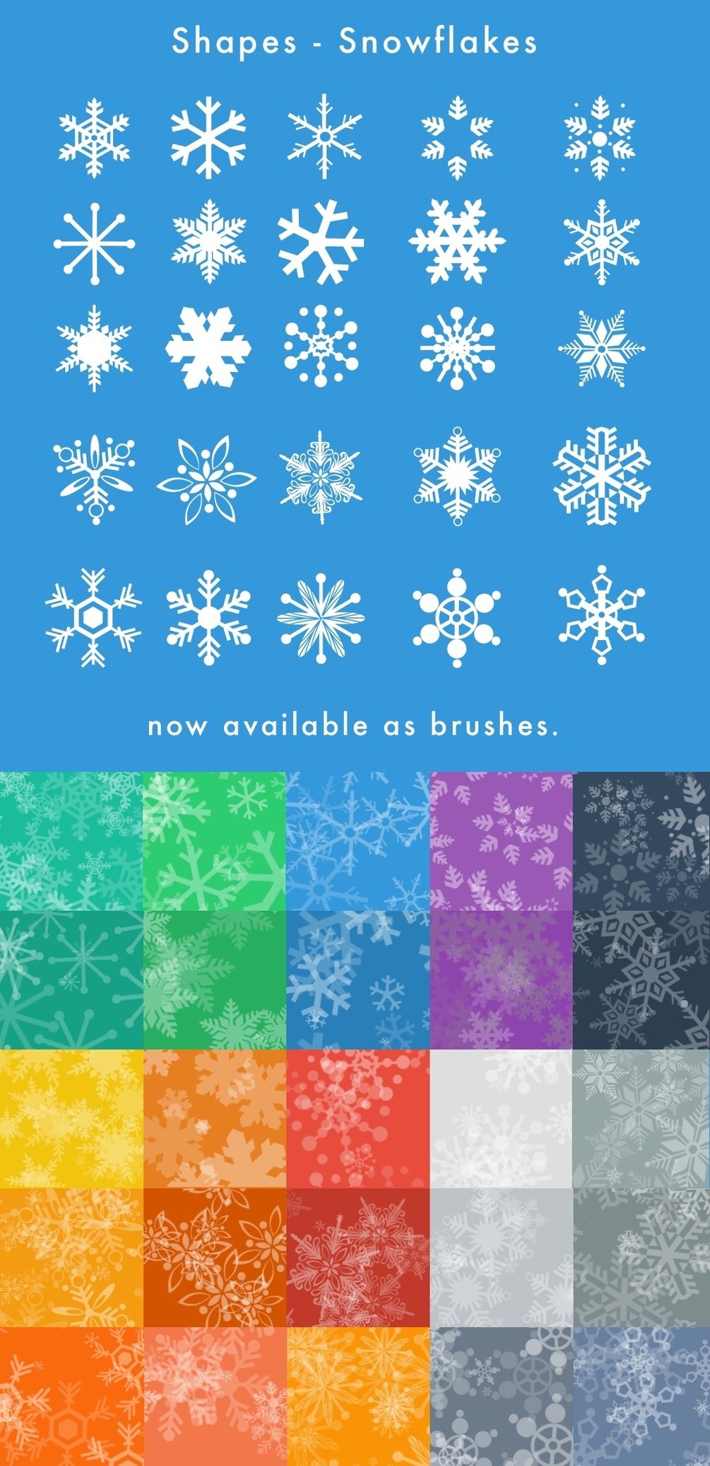 Premium Shapes (and Brushes) - "Snowflakes" contains 25 high quality snowflakes shapes and 25 snowflake brushes in a collection.